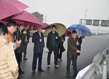 1月4日,市人大副主任沈利農(nóng)帶隊(duì),嘉興市藉省十二屆人大代表冒雨前往杭州灣大橋北接線二期工程開展現(xiàn)場(chǎng)調(diào)研,集團(tuán)公司總經(jīng)理李云鴻及嘉蕭公司相關(guān)人員陪同。圖為李云鴻總經(jīng)理現(xiàn)場(chǎng)為代表們介紹工程建設(shè)進(jìn)展情況。